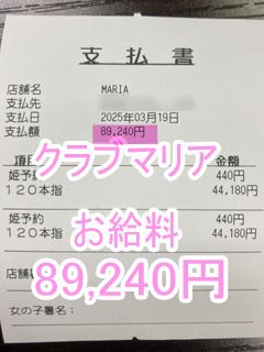 ❤3月19日のお給料紹介❤❤出勤時間:20:00~24:00❤勤務時間:4時間00分❤接客人数:2名様❤お仕事詳細240分本指名 89,240円この日のお給料89,240円キャストさんから一言【本指名様はロングコースが多いので有難いです】クラブマリアは稼ぎたい女性を全面サポート!…