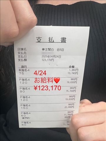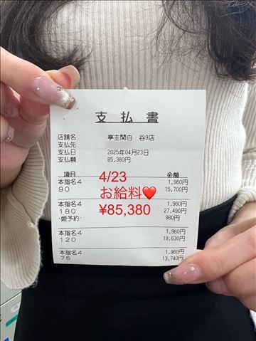💖 34歳 緊急出勤でしっかり稼ぐ 💖✨ キャスト募集中 ✨⏰ 受付時間:10時~19時📌 指名料金一覧 📌90分本指名180分本指名120分本指名75分本指名💰 ¥85,380 💰