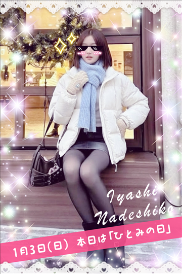 1月3日(土)今日は「ひとみの日」です🌸ついついスマホを見過ぎて、瞳がお疲れではないですか?👀癒しなでしこは完全個室待機&Wi-Fi完備✨リラックスして動画を見たりしながら、自分のペースで待機できますよ🍵新年からお財布も温かくしませんか?🎍90分9000円〜の高バックに加え、今なら入店祝金3万円もプレゼント中…