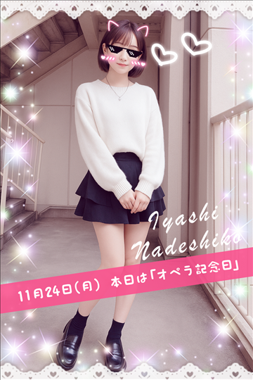 11月24日(月)今日は「オペラ記念日」です🌸美しく調和する歌声のように、癒しなでしこでは“あなたの魅力”がしっかり輝く環境をご用意しています💖Wi-Fi・電子レンジ・充電器・完全個室待機など、ストレスゼロで働けます💖安心してサクッと高収入稼いでみませんか?😊【*絶対もらえる*】面接交…
