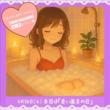 4月26日(土)今日は「よい風呂の日」です🌸お風呂に入ると、心も体もぽかぽかリフレッシュできますよね🛁✨癒しなでしこでは、頑張るセラピストさんに最高のリラックス環境をご用意しています🎀Wi-Fi完備、充電器・ブランケット貸出、タオル洗濯・掃除も不要!待機中も完全個室で、まるでお風呂上がりのようなリラックス感を�…