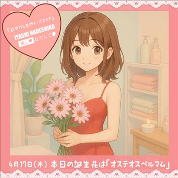 4月17日(木)今日は「オステオスペルマムの日」です🌸 花言葉は「元気・無邪気」🌼太陽に向かって咲く姿は、まるで前向きに頑張る女性そのもの✨癒しなでしこでは、未経験の方も笑顔で始められる環境を整えています💖完全個室待機&充実設備でリラックスしながらお仕事できます🎶明るく可憐に、あなたらしく咲ける場所がここにあ…