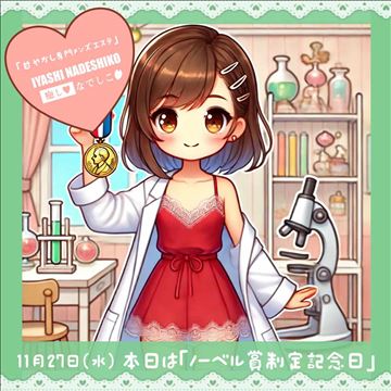 11月27日(水)本日は「ノーベル賞制定記念日」です🥇ノーベルといえば平和賞のイメージが強いですが、他にも物理学や化学、文学、生理医学の分野でも貰えるんですよね😊賞はもらえなくても、みんな日々誰かの為に頑張ってお仕事していることが偉いんですよ🌸人を癒すということ自体がすごく重要なお仕事になります⭐️【*絶対もら…