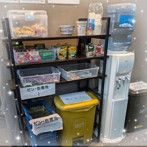 備品類として無料のスナックやカップ麺の軽食も常備してあり充実しています