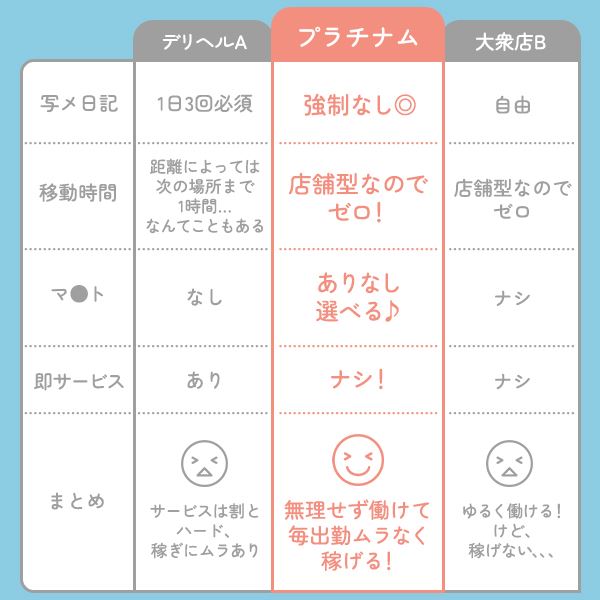 プラチナムは雑費がなくて稼いだ分全部手取り!スタッフさんも親切だし、距離感がちょうどよくて環境がすごい良いです。