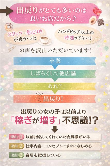 嘘偽りなしで真面目にやってきました。おかげさまで、ハンドサービス専門店の中では珍しい10年以上の老舗です。圧倒的な会員数がありますので、新人期間が過ぎても、また新たな会員様が蓄積されるため、ずっと安定して稼ぐことが出来るでしょう!