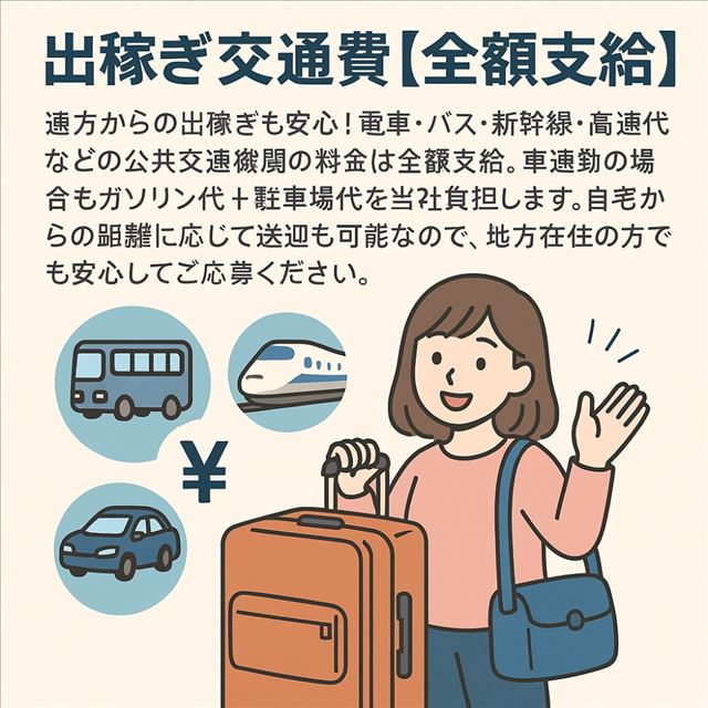 遠方からの出稼ぎも安心!電車・バス・ガソリン代などの交通費は全額支給します。自宅からの距離に応じて送迎やガソリン代対応可能なので、地方からの応募でも安心してお越しいただけます。