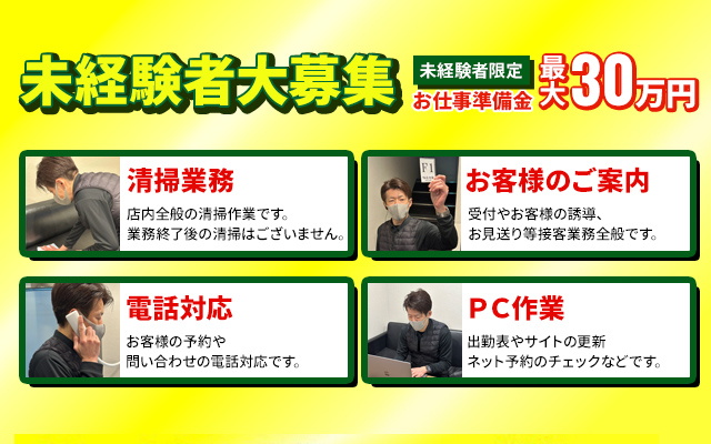 | 仕事内容 | 接客や電話応対、 面接や女性管理、 店舗運営や企画立案、 マネジメント業務、 WEBや紙媒体広告などの関連業務全般 |