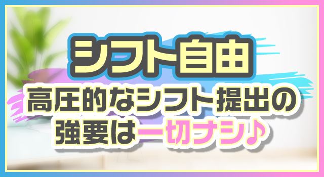 家族や彼氏から事務所に電話がかかってきたときの対応は完璧、書類の発行もしてくれるから公的な場面でも安心できるはず。指名本数のノルマもいっさいないからマイペースでオッケー、自分らしい魅力で収入アップできるくらいのゆとりをもって。