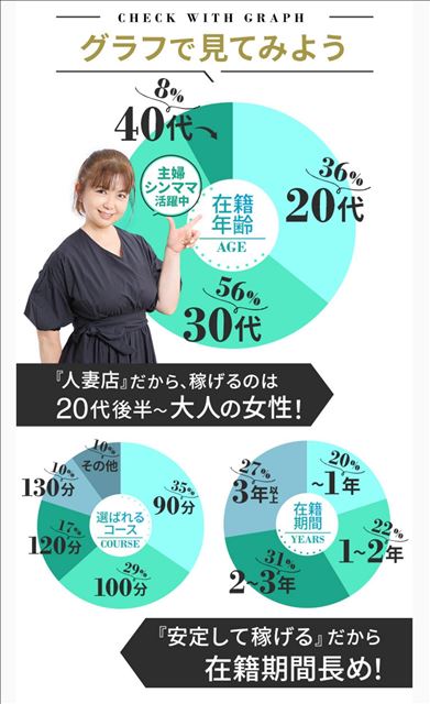 「もうトシだから…」なんて諦めていませんか? 当店は40代・50代の女性大歓迎しているお店です!特に30代女性急募中です!普通の主婦の方や、忙しいシングルマザーの方も多数活躍中!貴女のライフスタイルを尊重しながら、無理なく安定して稼げる環境を提供します。働く女性にとっての「居心地の良さ」!スタッフ間のサポート体制も万全で、ストレスなく働けているから在籍期間が長めなのも特徴なのです!