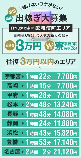 「遠方で移動費用が心配…」という方も安心してください。出稼ぎ移動交通費を最大3万円まで支給いたします。