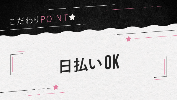 プレッシャーもなく自然体な笑顔でおもてなしできる雰囲気なら、男性の好みにやさしく寄り添ってあげる心のゆとりももてるように。もちろん働きやすさだけではなく稼ぎやすさもばっちり、お給料は日払い制でその日にすぐ確かめられるとモチベもぐんぐんアップします。