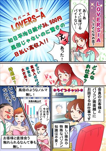 『今の収入ではちょっと物足りない……。』『でも風俗でバイトするのは抵抗が……。』という女性にオススメできるアルバイトです!!当店のLOVERS-Aのライブチャットは、スマートフォンやパソコンの画面を通じて、ライブ配信するだけなので無理をせずに楽しみながら、お客様…
