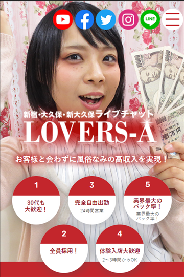 LOVERS-Aのライブチャットなら、スキマ時間に無理なくお金を稼いでいただけますよ!忙しい毎日を過ごしている、学生さん、フリーター、主婦、会社勤めしている女性にもオススメ♪風俗、キャバクラ、メンエス、オナクラと、色々な高収入バイトがありますが、LOVERS-Aのライブチャットならパソコン、スマホを通してライブ配信す…