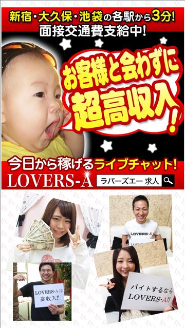 LOVERS-Aのチャットレディは、365日24時間いつでも貴女のペースに合わせてライブ配信していただくだけのお仕事です!!風俗、メンエス、キャバクラのようにお客さんと直接対面することがないから、性病の心配も一切なし!面接交通費支給中で~す♪皆さんのご応募お待ちしております┏○))↓↓↓…