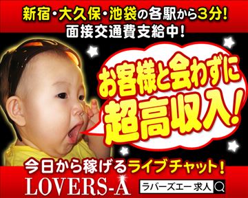 こんにちは。お客様と会わずに風俗店なみの高収入を実現!新宿、新大久保、池袋チャットレディ求人のLOVERS-Aです☆『勇気を出して風俗店に体験に行ったのに稼げなかった……。』というお話を当店に面接にお越しいただいた女性から多々聞きます。同じような思いをされた方がいらっしゃいましたら、ぜひL…