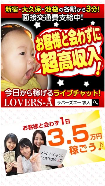 自宅に居ながら好きな時間に稼ぐことも、できる画期的なアルバイトです!!LOVERS-Aでは、自宅でアルバイトが難しい女性の為に、365日24時間好きな時間に使える駅近のチャトルームを多数用意してあります!!チャットレディ始めてという方も、過去にチャットレディをされていた方もLOVERS-Aまで、ぜひぜひ体験入店お越し…