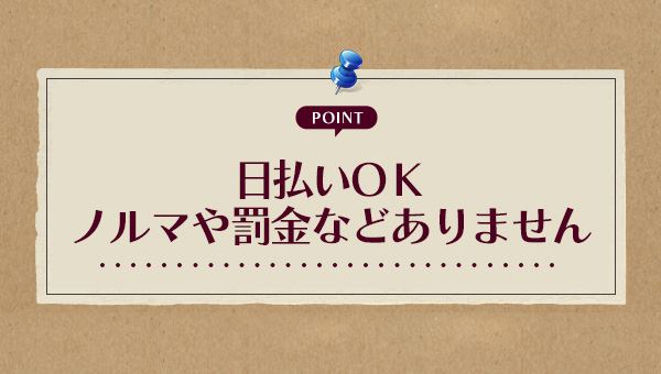 自然と気配りできるような気持ちのゆとりをもてるように、売上ノルマなどもいっさいなくポジティブに働ける居心地のよさもばっちり。前向きなモチベがアップする日払い制の待遇も整えていて、その日がんばって稼いだ分を確かめられるとやる気もみるみる高まるでしょう。