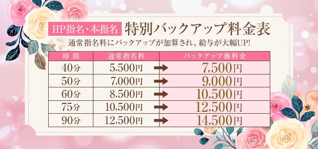 HP指名、本指名なら通常指名料+バックアップがついて
