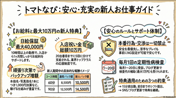 こんばんは!池袋西口にある店舗型ヘルス「トマトなび」スタッフです。これから夜のお仕事を始めようと考えているあなたへ♡「お給料のシステムはどうなってるの?」「安全に働けるかな?」など、最初は色々な不安がありますよね。そこで今日は、当店の「安心・充実の新人お仕事ガイド」の内容を分かりやすくご紹介します!① 最大10万円の…
