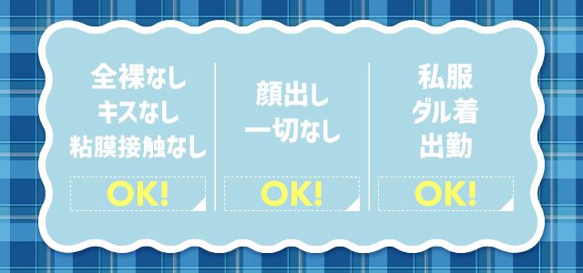 NGオプションややりたくないコースがあればNGにしても問題ありません。全裸なし・キスなし・粘膜接触なしOKです!