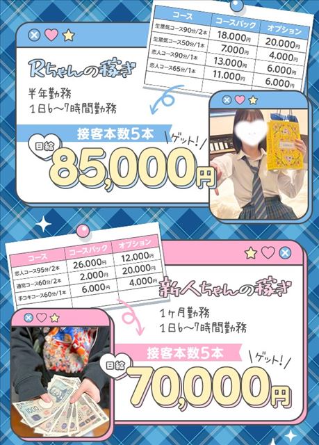 SNSの集客力がとにかく強いので新規も多いですし、制服好きのお客様のリピート率が高く、高額なお支払いをしていただける方ばかりです。実際に1日で4本ついて10万円以上稼ぐような女の子もいます!👏