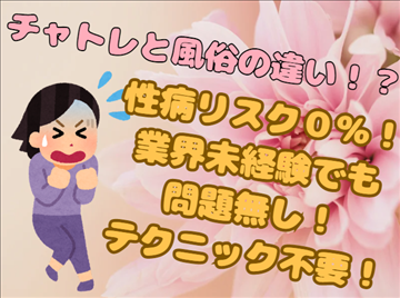 お疲れ様です! 先日、吉原の某お店で痛ましい殺人事件がありました。 上記のお店に限らず今まで何件も、女性が巻き込まれる事件が起きております。 チャットレディはPC越しの接客ですので、実際会う事もなく 住んでる地域などバレる危険性がありません。 そもそも会う事がNG行為ですので、バレた場合 お仕事が一生不可…