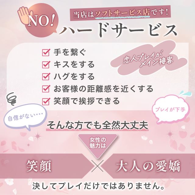 派遣型もちろんスタッフによるサポートや稼ぐためのプロデュースも、しっかりと対応していくため初心者さんでものびのび働けるはず。お客様のために丁寧におもてなししたり尽くしてサービスしたり、癒してあげようとする思いやりがあれば指名が増えるやりがいも感じられます。
