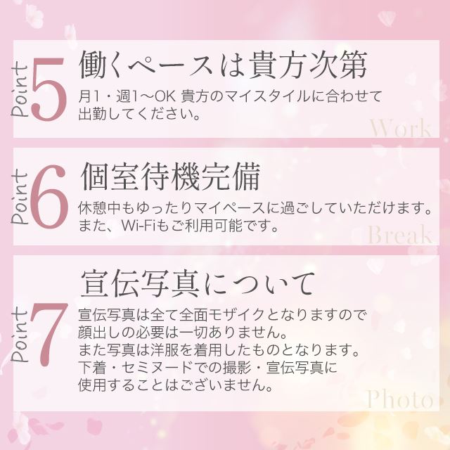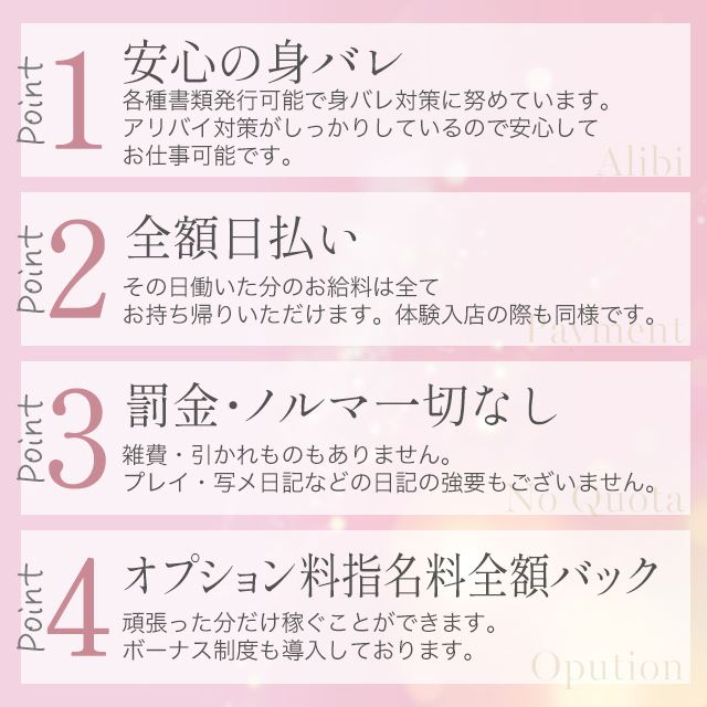 いきなり生理が来てしまった日にすんなり休めるのはもちろんのこと、ふだんの勤務でも不安に思わないように衛生対策も行っています。性病にかかってしまうと彼氏にバレたり出勤できなくなったり、いろんな面でデメリットになってしまうから安心できる待遇はばっちりです。
