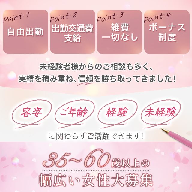 | 応募資格 | 35歳∼60歳以上 容姿・経験ではなく気持ちです 未経験大歓迎 |