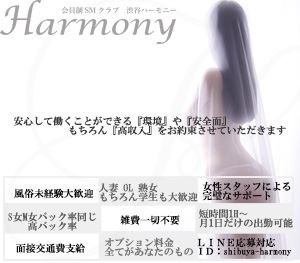 大人同士が互いの性癖を楽しむそんな社交場です。お約束するのは「安心」「安全」「安定」。そして高収入を実感しで下さい。SMは決してハードではありません!大人と大人の秘密の楽しい遊びです。決められたルールの中で楽しむ知的な大人のお遊びです。お問い合わせはコチラ▼会員制SMクラブ渋谷ハーモニーTEL03-3464-5130…