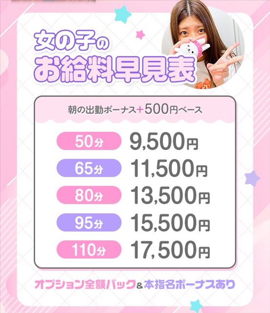 深夜ならロングコースでの指名が入りやすいですし、朝早くでも集客が安定していていつ出勤しても稼げます!さらに朝9時から11時の間に働ける方なら、プラスで500円単価がアップしますのでより効率よく収入アップできるようになります。掛け持ちしながらでもシフトが組みやすいはずです。