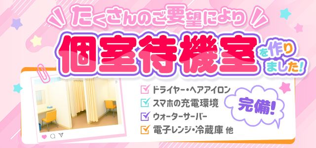 多数のご要望に応え、清潔でリフォームしたての完全個室待機室を完備しました。ドライヤーやスマホ充電器はもちろん、冷蔵庫・電子レンジ・ウォーターサーバーなど設備も充実。ほかの女の子との会話や派閥に気を遣う必要もなく、接客の合間も自分だけの空間でゆったりリラックスして快適に過ごせる安心の環境です。