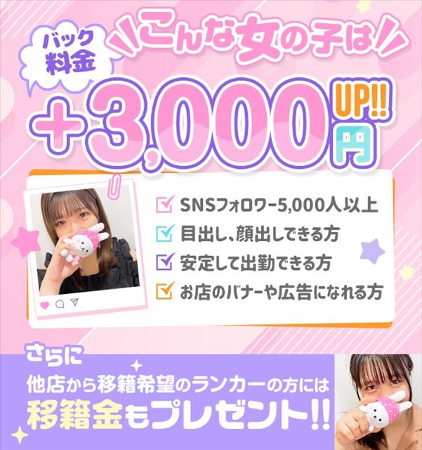 集客サイトでは常にトップクラスにランクインするほど、在籍する女の子たちのためを考え抜いた待遇やボーナスもたくさん用意しています。