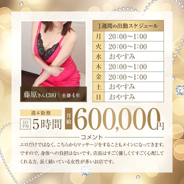 マッサージからはじまるかんたんなプレイ内容だから、テクニックに自信がない初心者さんでものびのび稼げます。オープンして10年以上という実績があるため会員様の数には自信あり。ありのままの魅力や年齢を活かした接客で稼げる上に、スタッフのプロデュース力も自慢です。