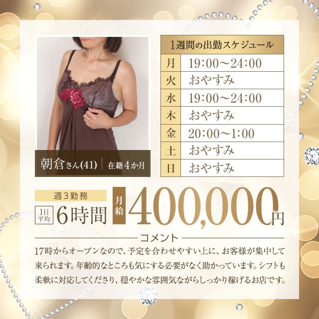スタッフたちをまとめる店長も女性だから、細やかなところにまで気を配れる居心地のいい雰囲気。叶えたい夢のために、お子様の将来のためにとかとか、がんばろうとするやる気があるならしっかり目標金額を達成できるようにバックアップします。