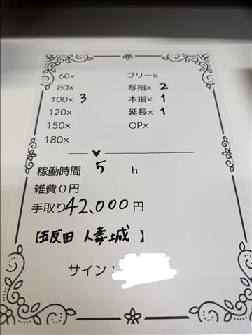♡遅番勤務のキャストさんのお給料♡12月は忙しくなってきますよ~!18時からラスト(22時受付)までの夜勤務されてる女性キャストSさんのお給料です✨短い時間にはなりますが、しっかり稼いで帰って頂いております!本指名・100分【13,000】写真指名・100分【11,000】写真指名・100分、延長30分【18,000…