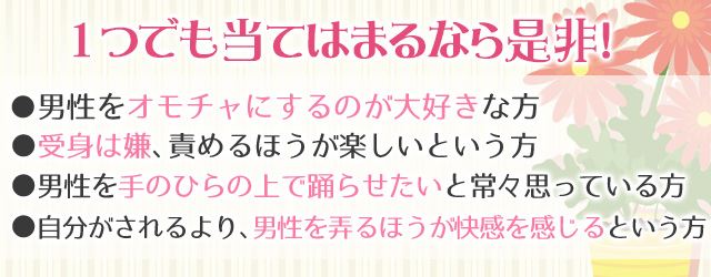 主導権を握るのはあくまでも女性であって男性はまったくの受け身、そんなコンセプトを理解して興味をもっているのなら年齢はいくつでも。