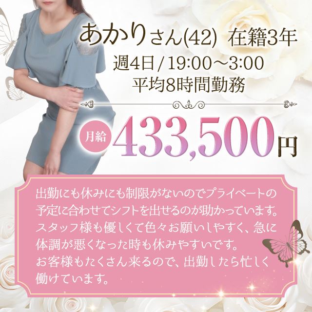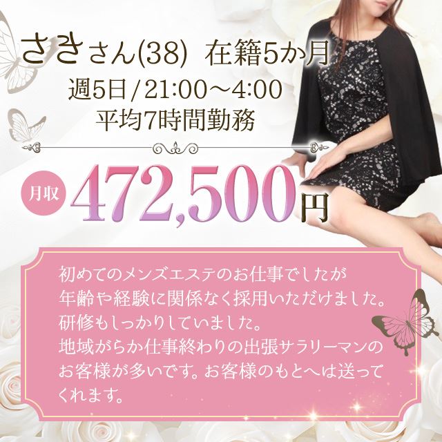 じっくりマッサージしたりとことん尽くしてあげたり、そんな控えめながらやさしさを感じられる人柄のよさにもお客様は虜に。自分らしさを活かしながらマイペースにガッツリ稼げるため、家事や子育てに忙しくあまり出勤ができなくてもちゃんと稼げるはず。