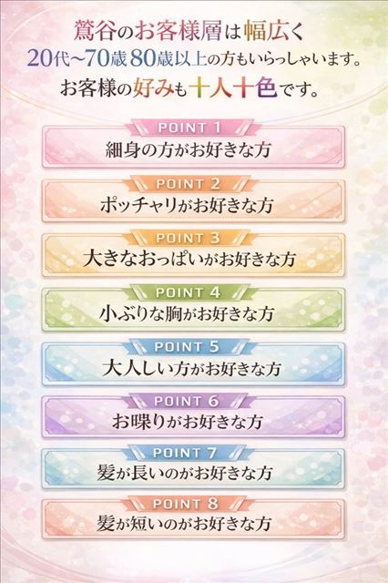 お客様に心地よく過ごしていただくための気配りや清潔感を大切にしていますので、外見よりも内面や所作を重視しています。ぽっちゃりさんも安心してご応募くださいね!