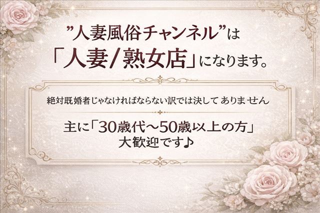 「人妻風俗チャンネル」は、40代・50代を中心に活躍する大人の女性たちが集まるお店です!特に既婚者やシングルマザーが多数在籍しており「子育ての合間に少しだけ」「本業の合間に無理なく」など、あなたのご都合に合わせて働くことも可能です!毎日のお仕事に活力を与えてくれる温かいスタッフも揃っています。落ち着いた雰囲気の中にも、みんなの笑顔と気さくな会話も溢れております!