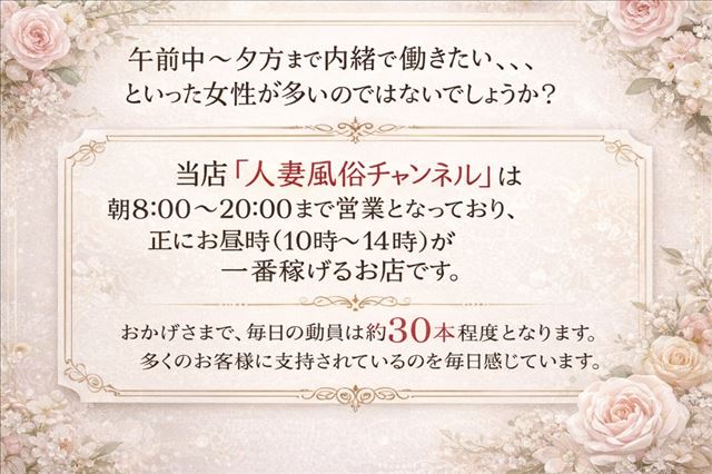 「人妻風俗チャンネル」では、午前中から勤務可能です。