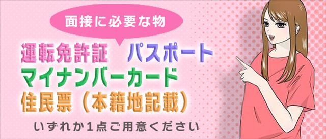 運転免許証・パスポート・マイナンバーカード・住民票のいずれか1点ご用意ください。