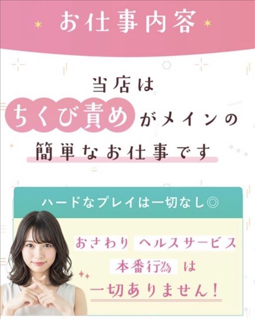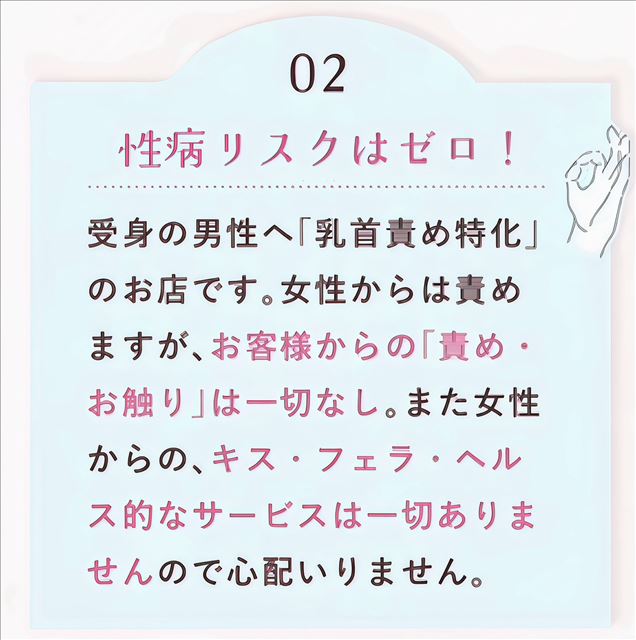 施術は手を使ったソフトな対応のみで、ヘルスサービスやキスなどの粘膜接触はありません。