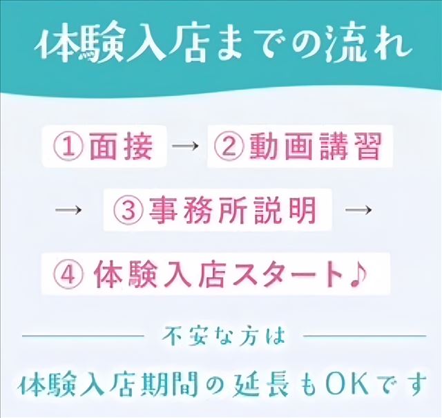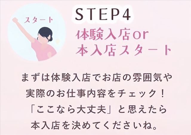 入店前に、実際の雰囲気や仕事の流れを見ていただけるよう体験入店を行っています。