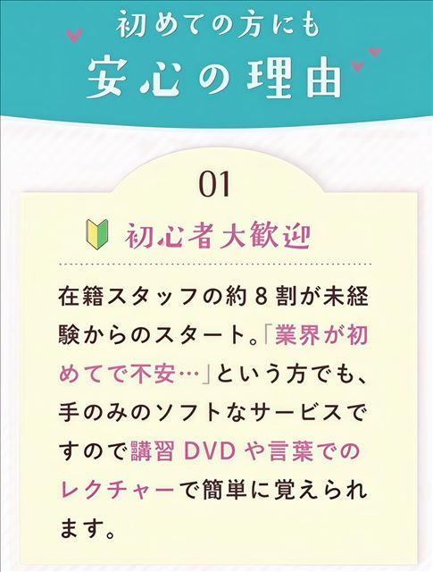 在籍している女性の多くは、最初はこの仕事が初めてという状態からスタートしています。