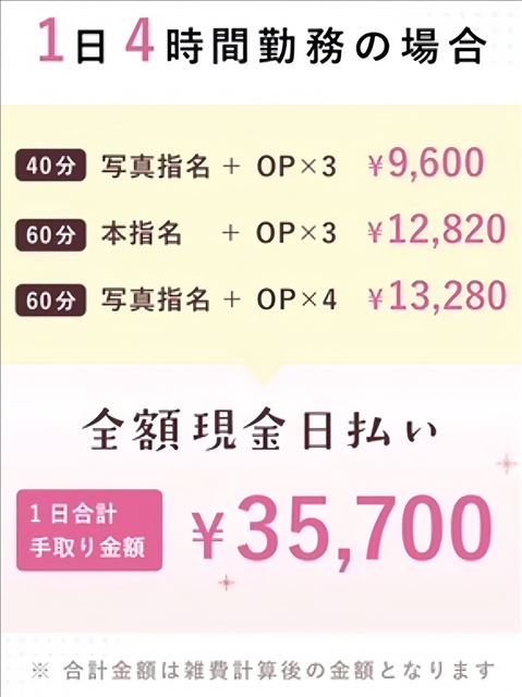 | 勤務時間 | 11:00~23:00の間で自由出勤制 短時間でも稼げます♪ |